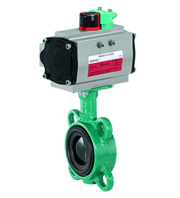 The soft seated butterfly valve has a metal actuator and is pneumatically operated. The "Normally Closed", "Normally Open" and "Double Acting" control functions are available. The butterfly valve is available in nominal sizes DN 25 to 1600 and in standard installation lengths ISO 5752/20 | EN 558-1/20 | API 609 category A (DIN 3202 K1) in wafer and lug body versions.