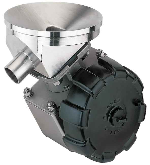 The 2/2-way tank bottom valve has a manual side mounted gear operator with a plastic handwheel. An integral optical position indicator is standard. The stainless steel valve body is machined from a single block (monoblock, no welded components). The metal distance piece and the operator housing are made from stainless steel.