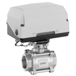 The GEMÜ B52 3-piece 2/2-way metal ball valve is motorized. It has a plastic actuator housing. A manual override and an optical position indicator are integrated as standard. The seat seal is made of PTFE.