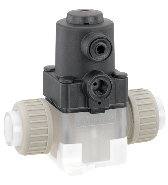 Das 2/2-Wege-Membranventil GEMÜ 610 verfügt über einen wartungsarmen Kunststoff-Kolbenantrieb und wird pneumatisch betätigt. Eine optische Stellungsanzeige ist serienmäßig integriert. Es stehen die Steuerfunktionen „Federkraft geschlossen (NC)“, „Federkraft geöffnet (NO)“ und „beidseitig angesteuert (DA)“ zur Verfügung.