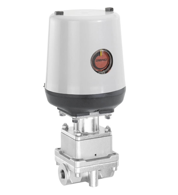 The GEMÜ 566 eSyStep 2/2-way straight seat control valve has a body with an integrated control mechanism. Pneumatic and motorized actuator types are available. The GEMÜ 566 eSyStep control valve was specially developed for controlling small volumes and allows flow rates from 63 l/h to 2500 l/h.