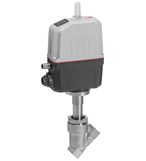 The is an electrically operated 2/2-way angle seat globe valve. The eSyStep electric actuator is available as On/Off actuator or with integrated positioner. The valve spindle is sealed by a self-adjusting gland packing providing low-maintenance and reliable valve spindle sealing even after a long service life. A wiper ring fitted in front of the gland packing protects the seal against contamination and damage. An integral optical and electrical position indicator is standard. The self-locking actuator holds its position in a stable manner when idle and in the event of power supply failure.