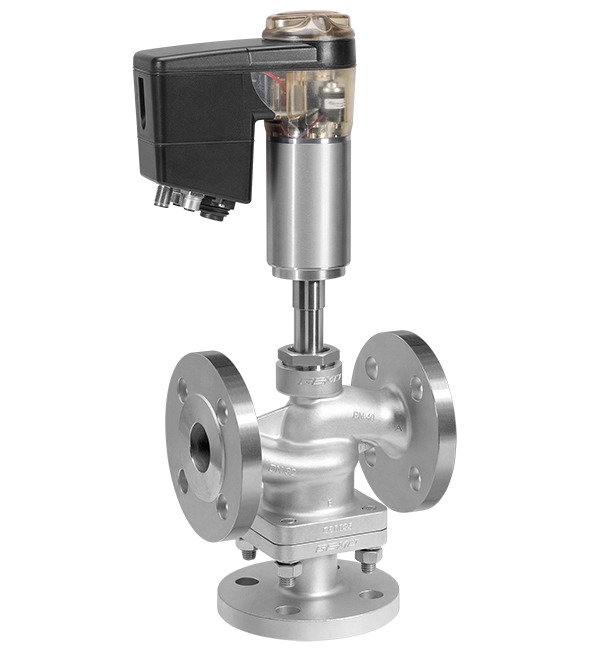 Type 343 Multi-port globe valve, electrically operated, electro-mechanical hollow shaft actuator, body with flanged connection, eSyDrive
