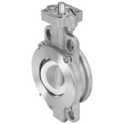 Butterfly valve, double-eccentric, bare shaft, long service life, low friction thanks to direct separation of seat and disc, continuous and blow-out proof shaft, with antistatic unit and low-maintenance spindle seal, can be readjusted