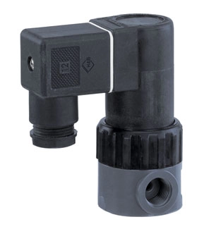 The directly controlled 2/2-way solenoid valve has a completely plastic encapsulated coil. The armature is sealed by a bellows made of PTFE backed by an additional safety diaphragm. The valve body is available in various materials and with a straight through or angle valve body design.