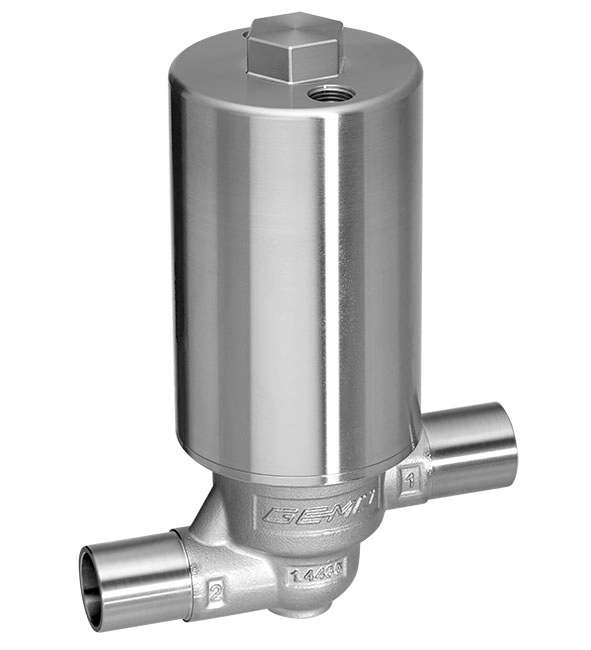 The 2/2-way filling valve is designed for filling processes in aseptic and hygienic applications. Flow rates of up to 18,500 l/h are possible, depending on the design. The sealing concept of the valve is based on the GEMÜ PD design, whereby the actuator is hermetically separated from the medium. All actuator parts (except the seals) are made from stainless steel. The "Normally closed" and "Normally open" control functions are available.