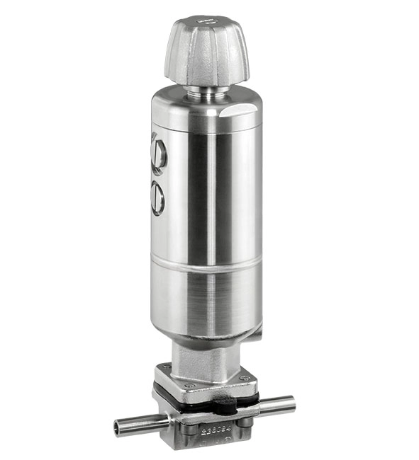 The 2/2-way diaphragm valve has a stainless steel piston actuator and is pneumatically operated. The valve is designed for use in a sterile environment. All actuator parts are made from stainless steel (except seals). The compression springs of diaphragm sizes 80 and 100 are made of epoxy-coated spring steel. Normally Closed (NC), Normally Open (NO) and Double Acting (DA) control functions are available. An integrated optical position indicator is standard.